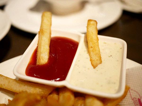 薯條超酥脆又刷嘴,沾醬是番茄醬與凱薩醬,沾或不沾都好吃!